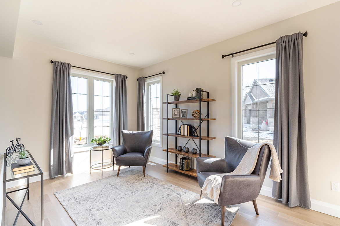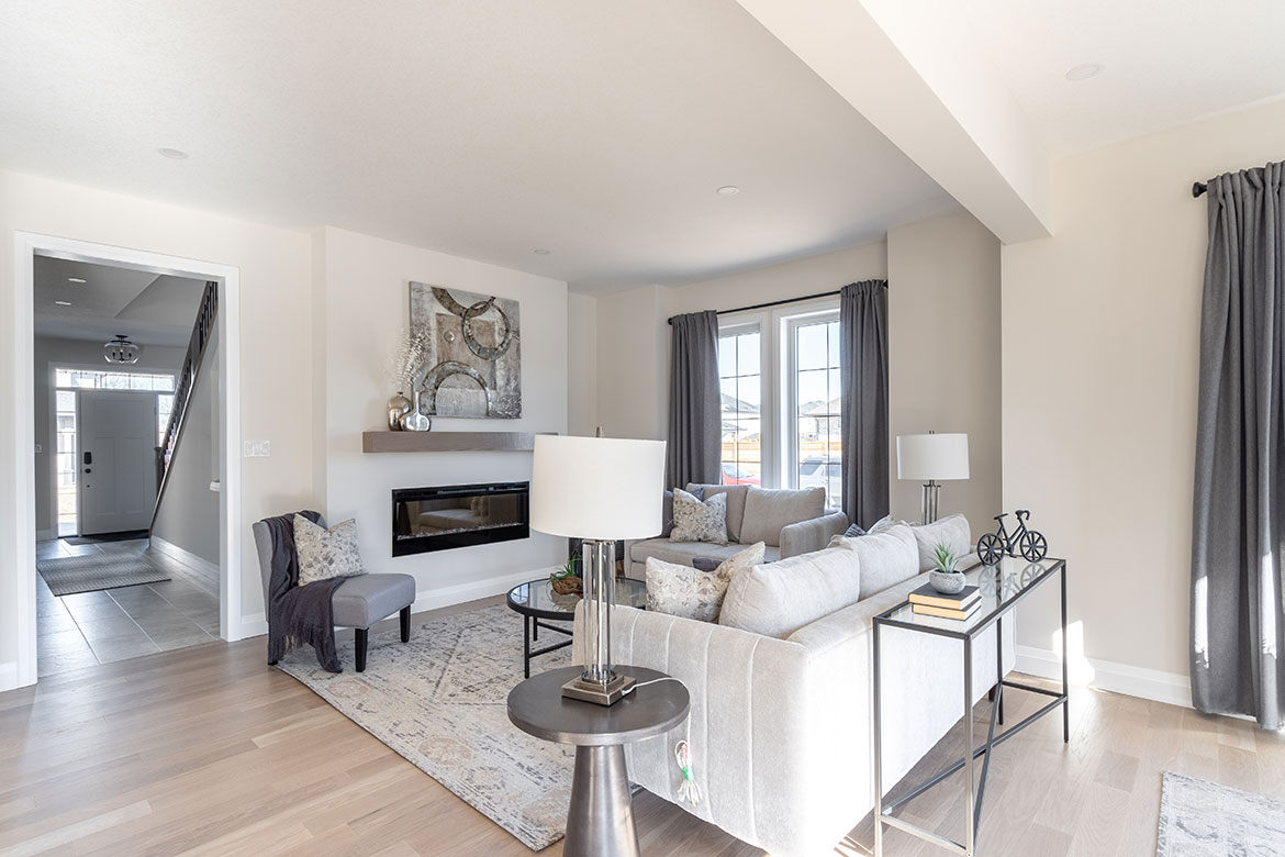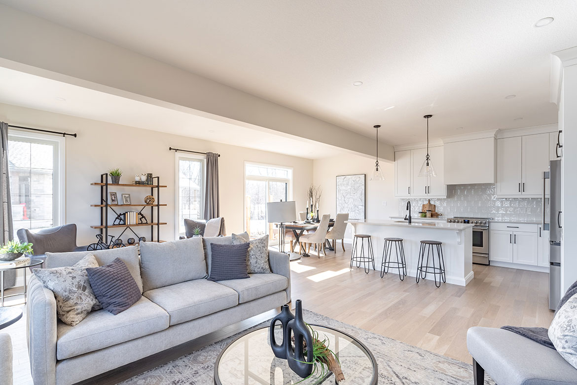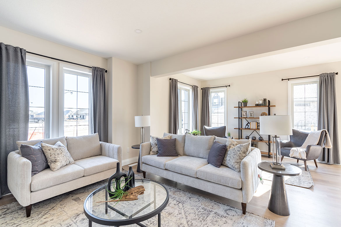At 49 Royal Dornoch, our professional designers bring timeless tradition to life with carefully curated interiors. Spacious, open concept living areas exude a natural ambiance welcoming a harmonious flow from room-to-room. Natural light streams in through large windows that also showcase beautiful scenic views. High end finishes include gourmet kitchens with quartz countertops, premium hardwood and ceramic flooring, luxury ensuites with a tiled shower and soaker tub, custom cabinetry and hood vent, decorative lighting and strikingblack accents throughout.